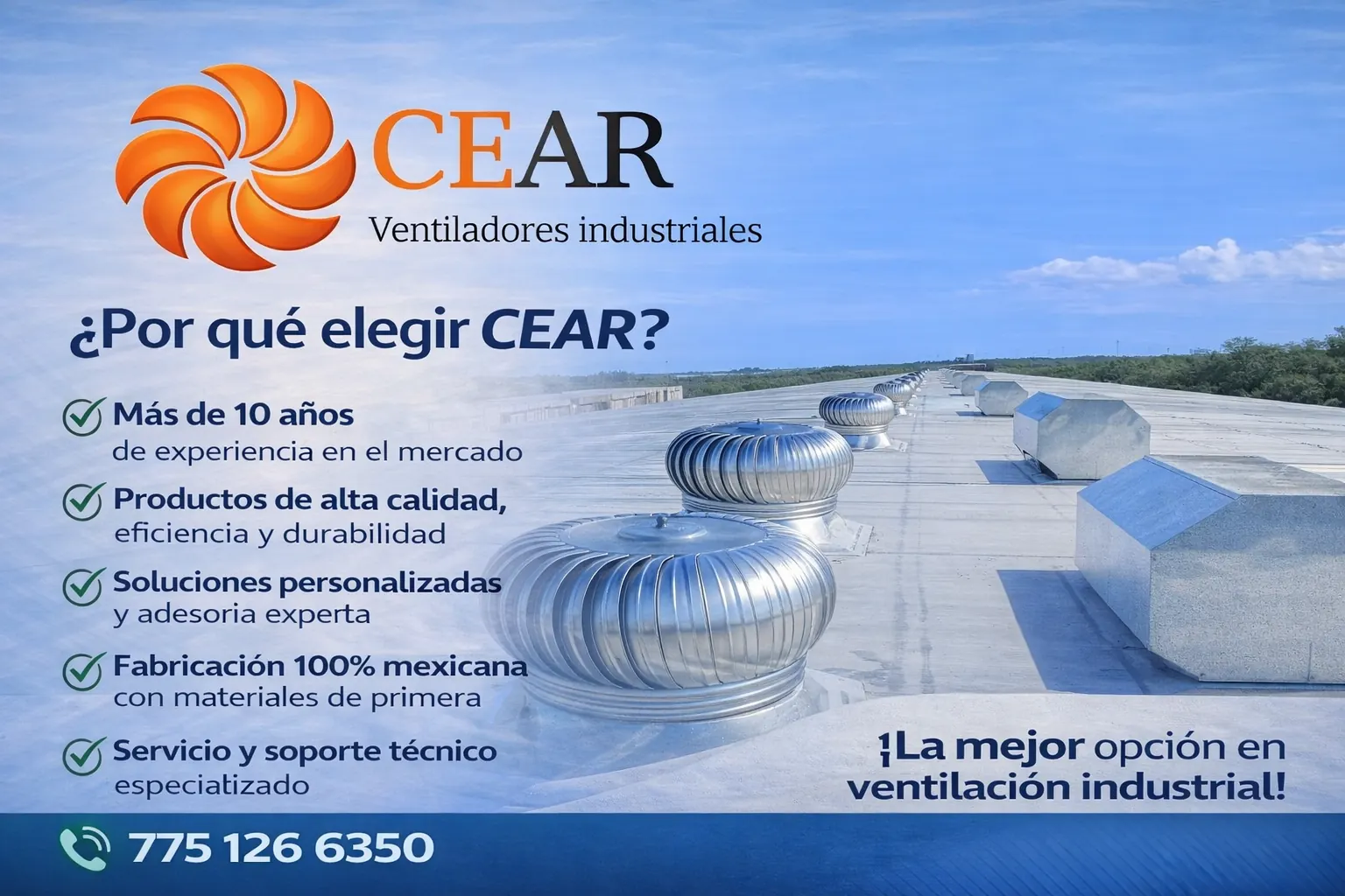 Con envíos a toda la República Mexicana, Ventiladores Industriales CEAR es tu mejor opción para soluciones de ventilación industrial confiables y eficientes. Nuestro objetivo es satisfacer las necesidades de ventilación de nuestros clientes en todo el país, proporcionando productos de calidad y un servicio excepcional.